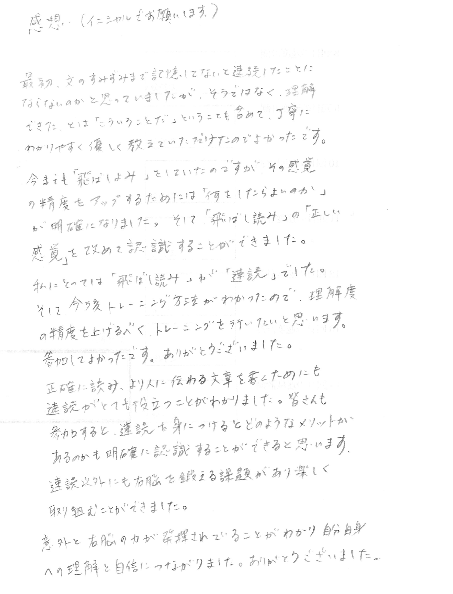 | ╋╋…‥・ ・・‥‥…━━━━━━━━━━━━━━━━╋ 願望実現に補助線を引こう http://showon-sato.com ┃ サラリーマンで年収1000万円を目指せ ┃ ・・・━ 第3853号 ━ ・・・ ━━━━━━━━━╋…‥・ ・・‥‥…━━╋━━━━━━ おはようございます、佐藤正遠(さとうしょ~おん)です。 このメールマガジンは、当初成長を目指す若手サラリーマンのために書き始めたのですが、 連載開始から13年、今では自営業者、女性、リタイアされた方々からも幅広い支持を頂く ようになりました。 その結果、2014年まぐまぐ大賞のビジネス・キャリア部門で大賞を、そこから2021年まで 8年連続でキャリアアップ部門で受賞しています。 私がどんな人間なのか?はウェブサイトのプロフィールを読んで下さい。 http://showon-sato.com/index.php/about1/ バックナンバーは、以下リンクから検索出来ます。データベースの更新は不定期に行って いるので、最新号が反映されない事があります。またここではキーワード検索が出来ます ので活用して下さい。 http://showon-sato.com/index.php/magazine_log/ 成長したい、自己実現をしたいと本気で考える人のために作った、死ぬまでにこれだけは 読んでおけ!という「良書リスト」は以下リンクからダウンロード出来ます。 http://showon-sato.com/index.php/g_books/download/ 本も読まずに願望実現が出来るほど、人生は甘いもんじゃありません。読書の習慣を身に 付けられない人は、願望実現とは縁が遠いので、すぐに解除してもらった方が良いかも知 れません。 ツイッターは2つのアカウントがあります。 https://twitter.com/SatoShowon こちらは私の日常をツイートしています。 https://twitter.com/salary_1000man こちらはメールマガジンの過去ログを要約したモノを定時配信しています。 LINEでもメルマガを配信しています。ここでしか流さない情報も出しています。 登録は以下のリンクからどうぞ。 https://line.me/R/ti/p/@qcy6795q ☆★☆★☆★☆★☆★☆★☆★☆★☆★☆★☆★☆★☆★☆★☆★☆★☆★☆★☆ ◆ 今日の前フリ ◆◇ 引き続き、速読編での感想をシェアします。今日は、JIさんです。 === 最初、文のすみずみまで記憶してないと速読したことにならないのかと思っていましたが、 そうではなく、理解できたとは「こういうことだ」ということも含めて、丁寧にわかりや すく優しく教えていただけたのでよかったです。 今までも「飛ばしよみ」をしていたのですが、その感覚の精度をアップするためには「何 をしたらよいのか」が明確になりました。そして「飛ばし読み」の「正しい感覚」を改め て認識することができました。 私にとっては「飛ばし読み」が「速読」でした。 そして今後トレーニング方法がわかったので、理解度の精度を上げるべくトレーニングを 行いたいと思います。 参加してよかったです。ありがとうございました。 正確に読み、より人に伝わる文章を書くためにも、速読がとても役立つことがわかりまし た。皆さんも参加すると速読を身につけるとどのようなメリットがあるのかも明確に認識 することができると思います。 速読以外にも右脳を鍛える課題があり、楽しく取り組むことができました。 意外と右脳の力が発揮されていることがわかり自分自身への理解と自信につながりました。 ありがとうございました。 === 原文のスキャンはこちらから。 https://showon-sato.com/blog/wp-content/uploads/2022/01/JI.png この方は初速が760文字/分だったのが、ピーク値で23850文字/分になって、最終測定では 4200文字/分で着地しました。 この方のアンケートでは一部誤解されているようなところがあるので取り上げました。速 読は飛ばし読みではありません。飛ばし読みをしているように感じるだけで、周辺視野を 使って全ての文字を入力しているのです。中心視野を使って一文字ずつゆっくりと取り込 んでいないので、飛ばし読みをしているような感覚になるのですが、読んでいないようで 実はちゃんと周辺視野で全ての文字をインプットしているんですね。 それができるためには、周辺視野で受け取れる訓練が必要でこれが右脳を使うということ です。立体視や視野拡大訓練、指回し、右脳を使ったお絵描きはそのための訓練で、それ を応用したのがイメージ連結による記憶法なのです。 さて昨日はスキーに行くのを止めて、終日仕事をしていました。易経の占断を書き進めつ つ、新春セミナーの案内メールを書きました。 全国的にオミクロン株による感染拡大が続いていますが、感染者の増加数と重症者の増加 数が以前とは全く異なる動きをしていることに注目すべきです。沖縄で感染爆発と言われ ていますが、日曜日の時点で重症者はゼロでした。東京でも毎日過去最高を上回る勢いで 感染者は増えていますが、重症者は未だに一桁なのです。 つまり以前のインフルエンザと同じ程度の危険度になったということで、感染しないに越 したことはないけど、過度の恐怖心は不要だということですよ。特にワク